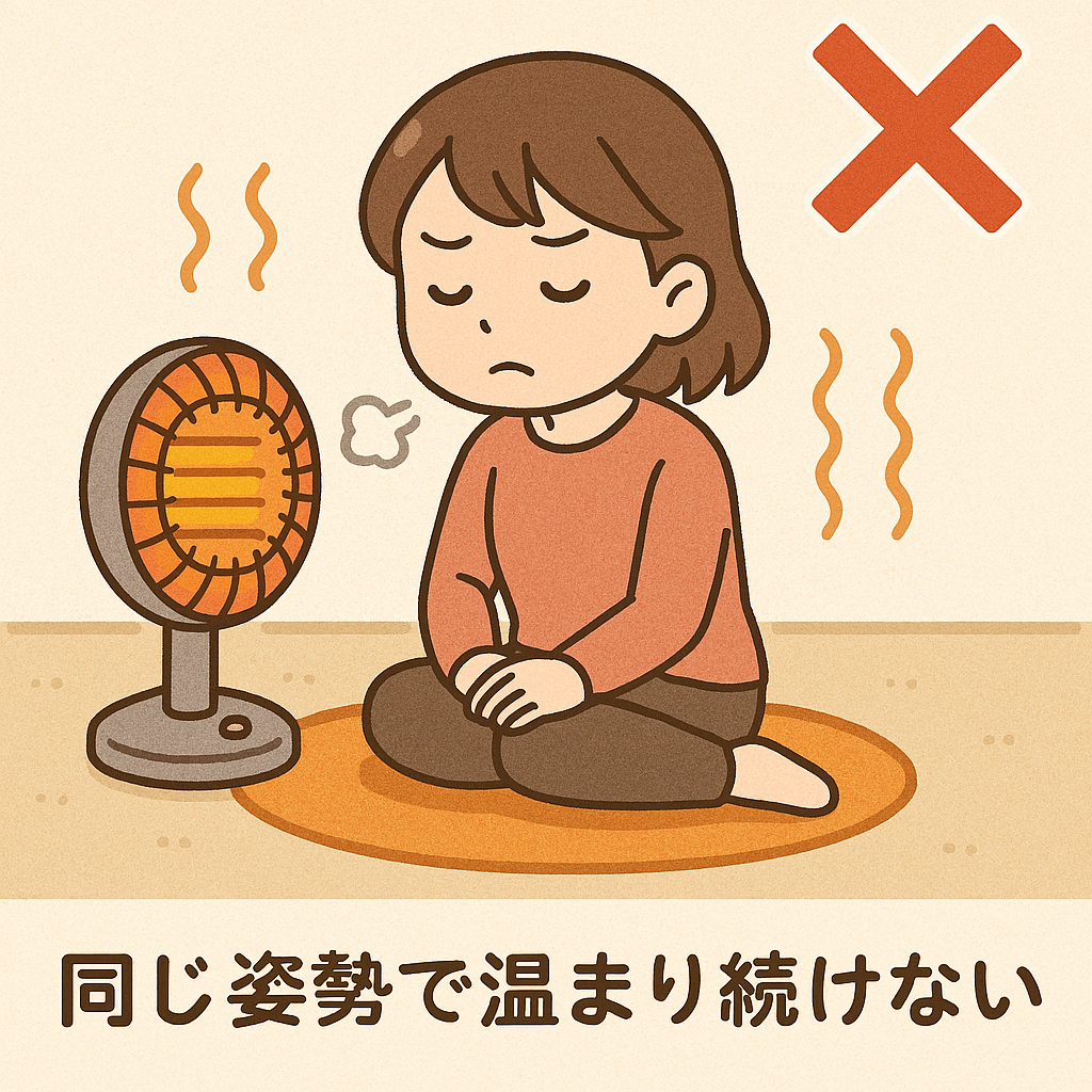 同じ箇所が長時間温熱にさらされると危険です。30〜60分に一度は姿勢を変えたり、暖房器具から離れたりする習慣をつけましょう。