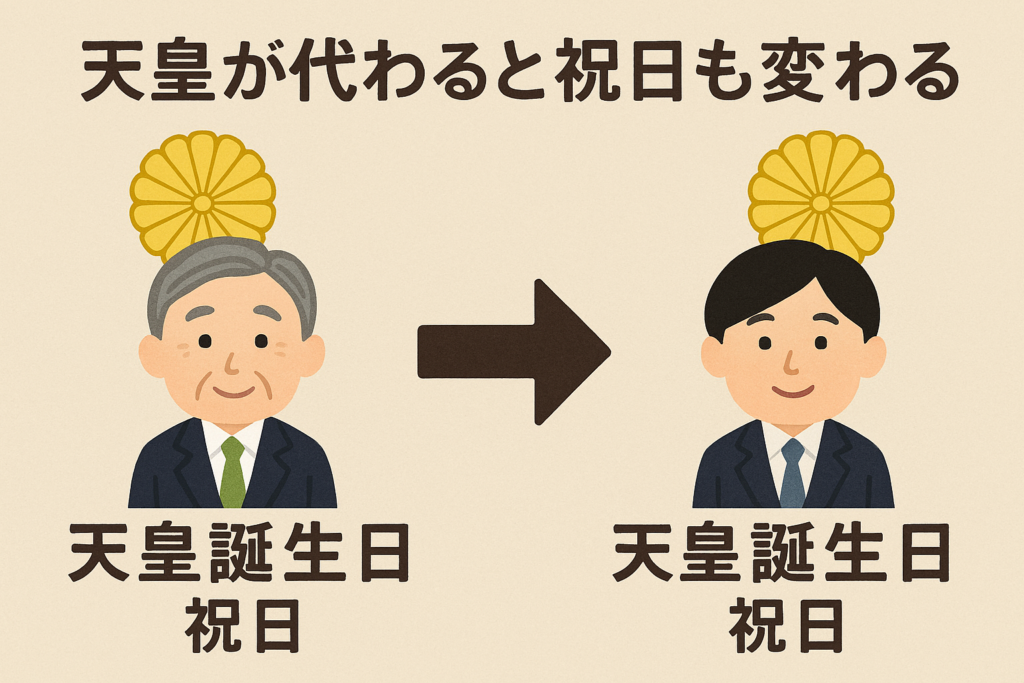 天皇誕生日の大きな特徴は、天皇の代替わりによって日付が変更される点です。これは日本の祝日の中でも非常に珍しい仕組みです。