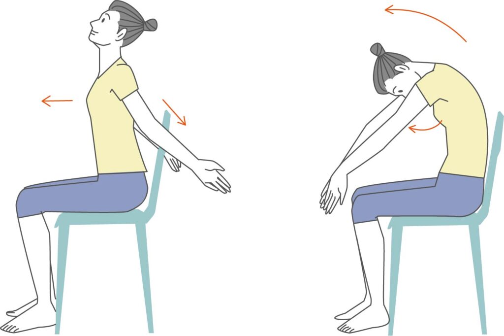 椅子に座ったままでもOK。背筋を伸ばし、ゆっくりと首を左右に倒しましょう。反動はつけず、呼吸を止めないように意識して。次に、肩をゆっくり大きく回します。前まわし・後ろまわしを各5回ずつ。肩の力が抜けて、呼吸もしやすくなります。
